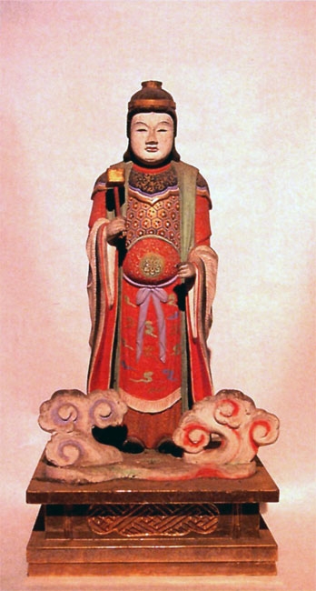 小郡市大埼(おおざき)にある「七夕神社」にまつられているのは、赤い中国風の衣裳をまとい、手に糸巻きを持つ女性の像です。この七夕神社(媛社(ひめこそ)神社)には、媛社神(ひめこそのかみ)と織姫神(おりひめのかみ)がまつられていますから、この像は、七夕物語の織姫をモチーフにして彫られたものであろうと思われます。像には『明和六年三月十日京寺町通三条上二丁目 大仏師 中村杢之丞』と彫られています。この御神体が彫られた(奉納された)期日と、作者の住所・号(名)でしょう。明和六年=一七六九年ですから、今からおよそ二百三十年前に彫られたものです。