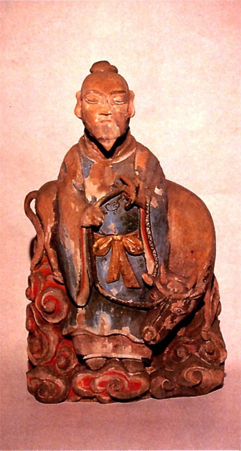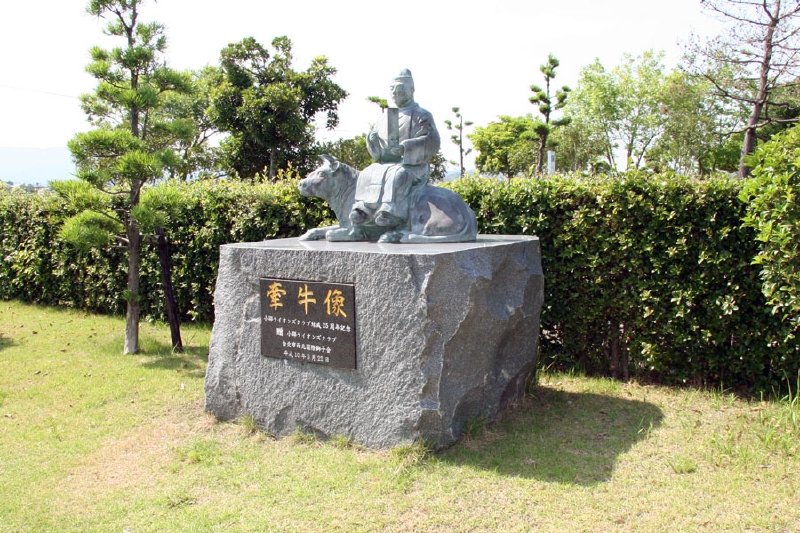 老松宮にまつられている犬飼神の御神体 稲吉(いなよし)という集落にある老松宮には犬飼神(いぬかいしん)の御神体がまつられています。この犬飼神は、犬飼宮(いぬかいぐう)という宮でまつられていたのですが、大正十二年のほ場整備(水田の区画整理)の時に現在の老松宮に合祀(ごうし)(合わせてまつる)されました。(犬飼宮の跡地は、老松宮より三百メートルほど北の水田の脇に残っています)。この犬飼神の御神体も七夕神社の御神体とほぼ同じ時期に作られたようです。青い中国風の服をまとい牛を連れています。牛を連れているのに「犬飼神」とは?と思いがちですが、千年程前の社会では、動物を飼う職業が分業であり、犬は狩猟用の家畜として飼われていたので、牛や馬などの家畜ともつながりがあったからではないかと推測されます。