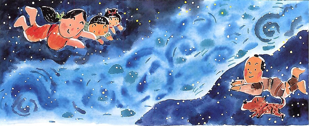 彦とアカはそれで元気をとりもどして、牛のせわをしはじめた。織姫も紫色の美しい布を織りながら、次の年の七月七日がくるのを子どもたちと楽しみにしている。