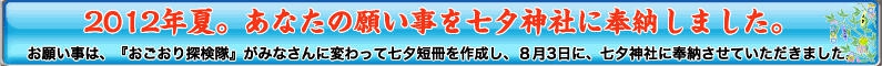 NPO法人地域インターネットフォーラムでは、国内、海外より750通もの願い事をインターネットで受付し、大切にお預かりしました。たくさんの「願い事」はボランティアの方に代筆していただき、小郡市の七夕神社で8月3日(金)午前11時から短冊を奉納いたしました。皆様の願い事が、叶うことを願っています。